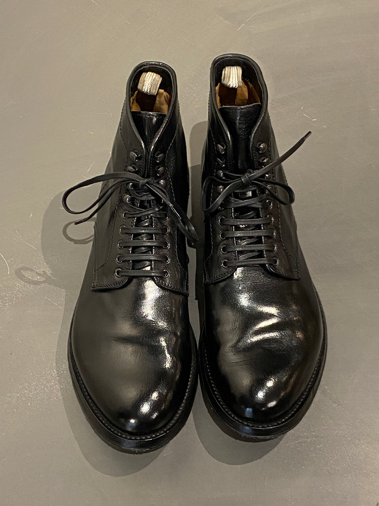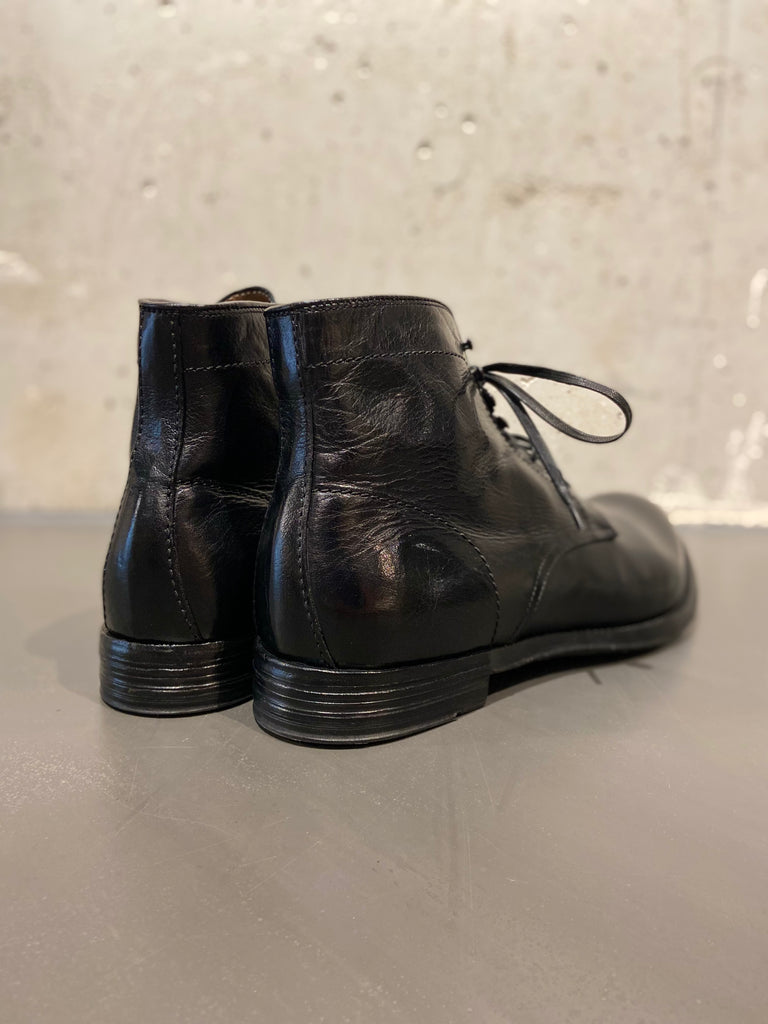 Officine Creative's versatile and comfortable, Anatomia artisan ankle boots catch the eye thanks to the airbrushed finish in colour black. They are crafted from soft leather and feature an almond toe, front lace-up, our signature grosgrain heel pull tab and a leather sole with a low stacked heel and black rubber inserts.