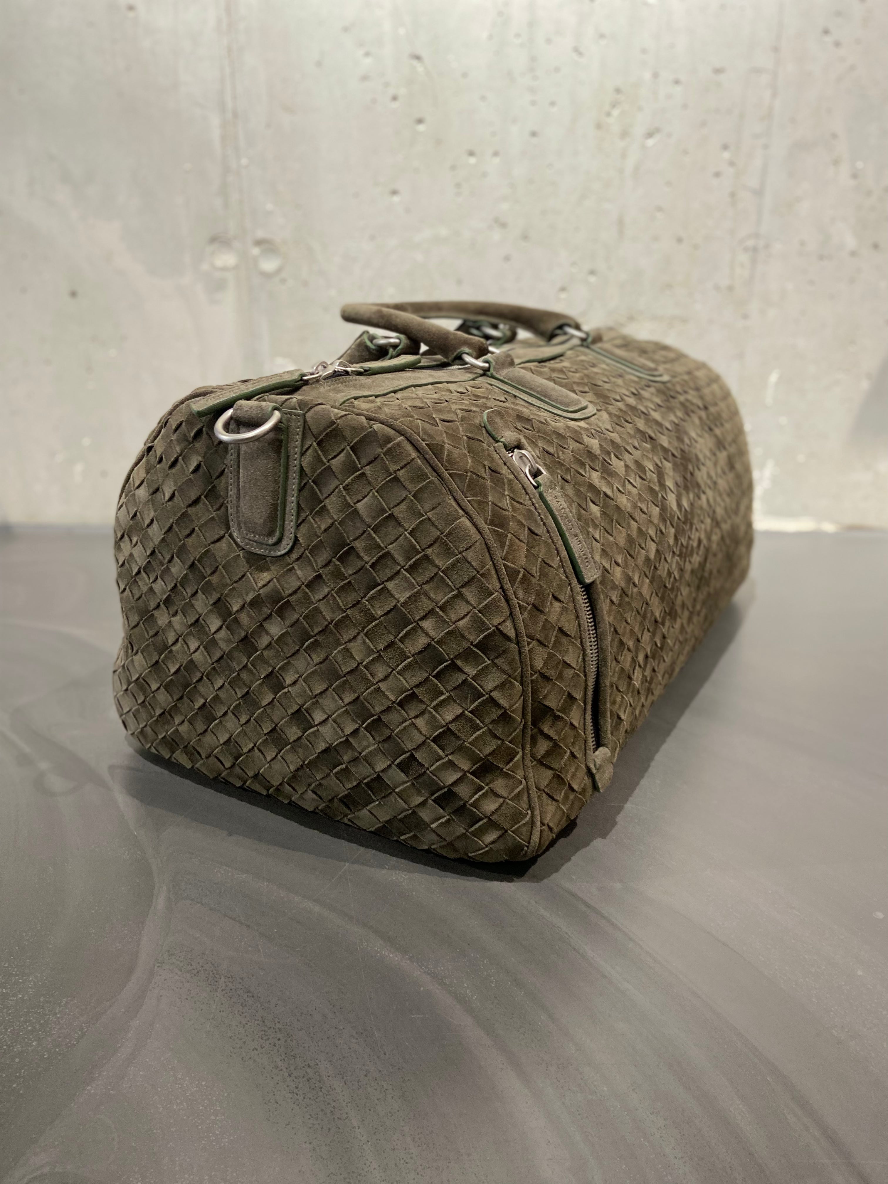 Officine Creative's duffle bag with rounded and roomy silhouette, two top handles and an adjustable and detachable shoulder strap in suede leather. The main compartment closes by two-way zip fastening and a pocket vertical zipped at the front.