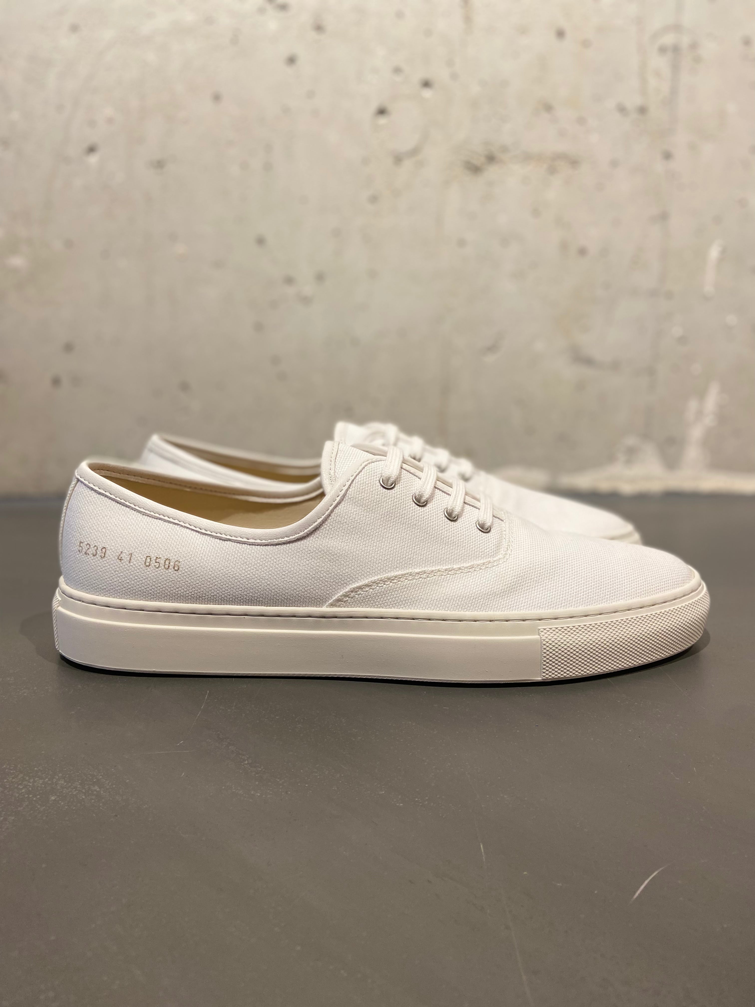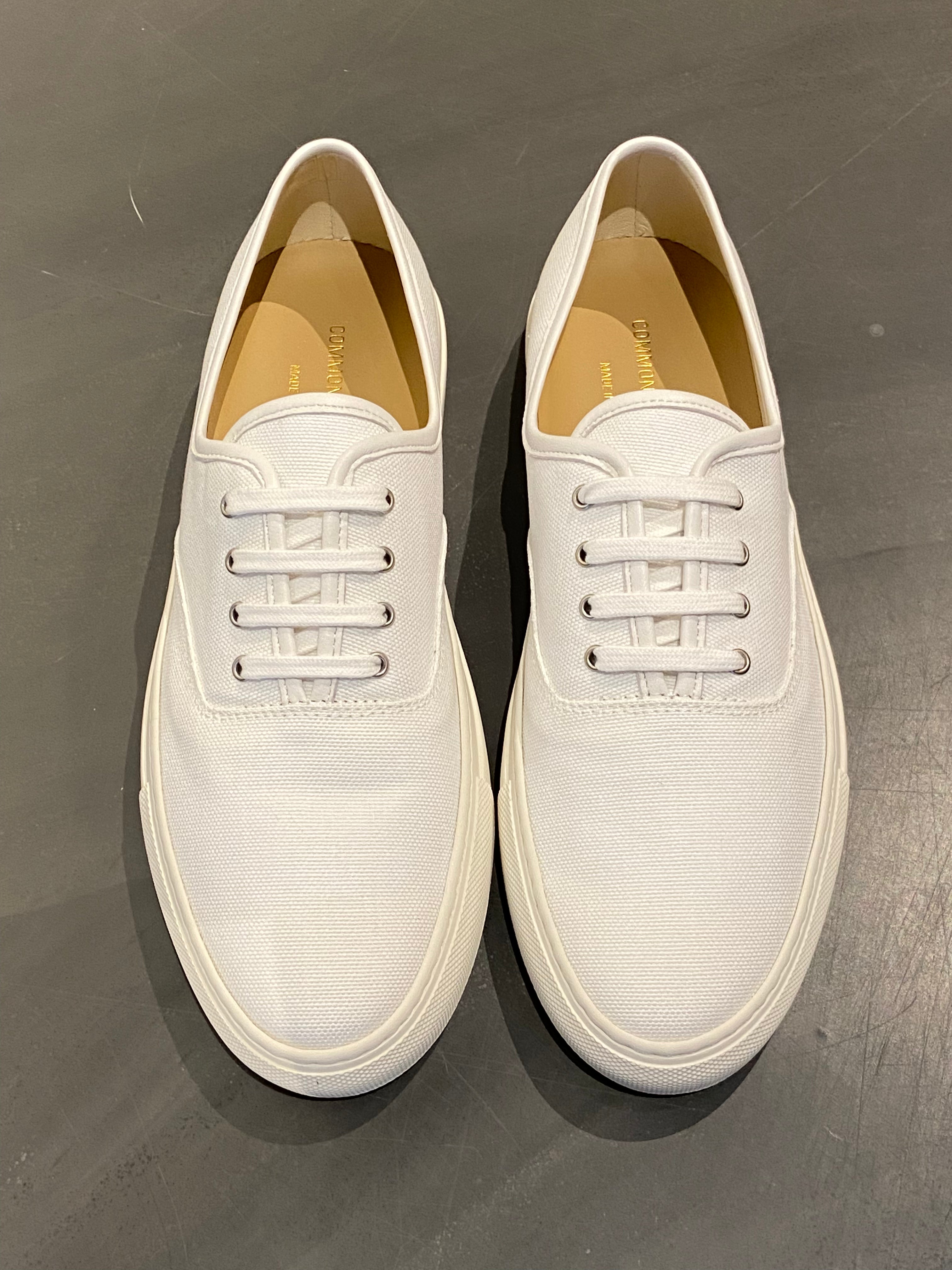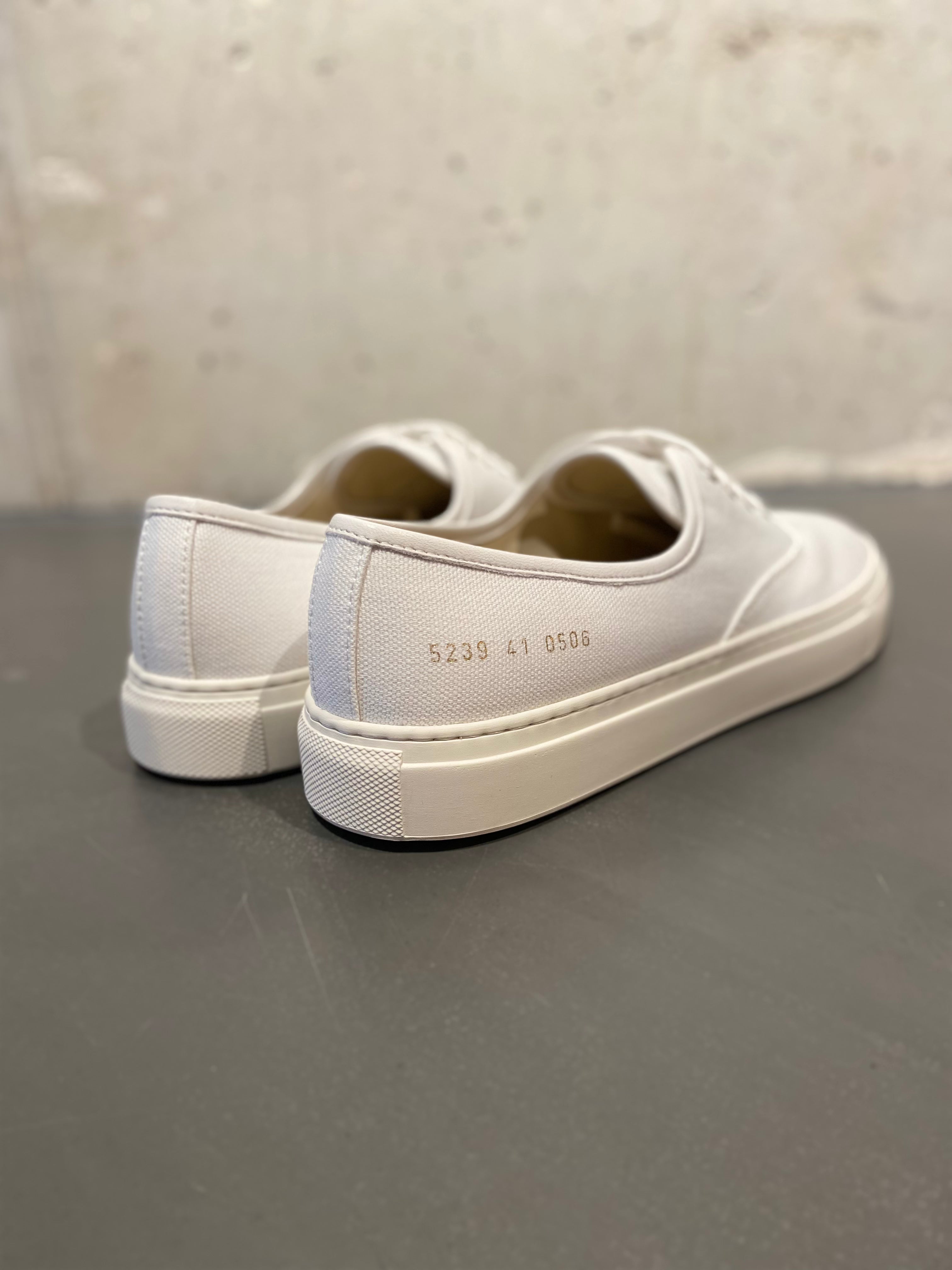 Classic slip-on from Common Projects in white canvas. Features tonal rubber sole, partial leather lining, metal eyelets, and gold foil stamp on heel. The canvas upper gives a more casual, laid-back feel while retaining Common Projects' signature minimalist aesthetic.