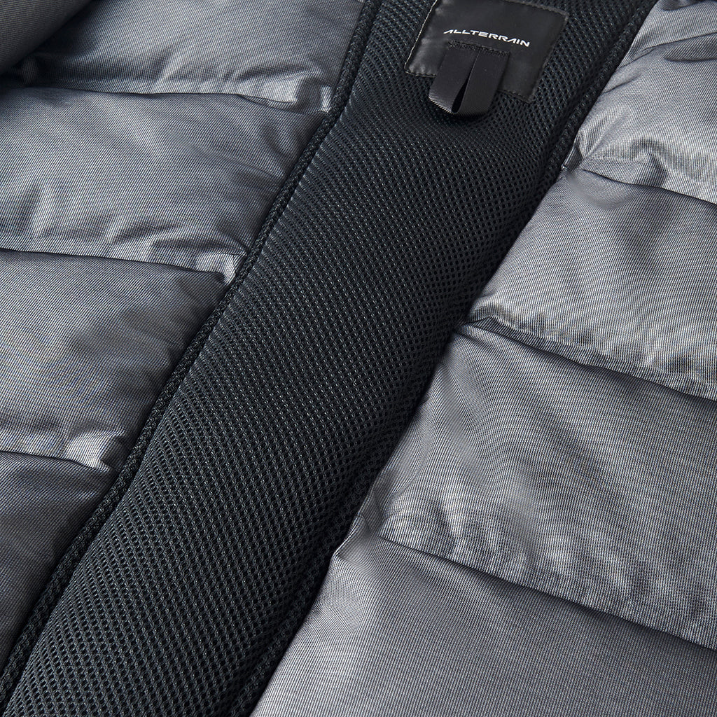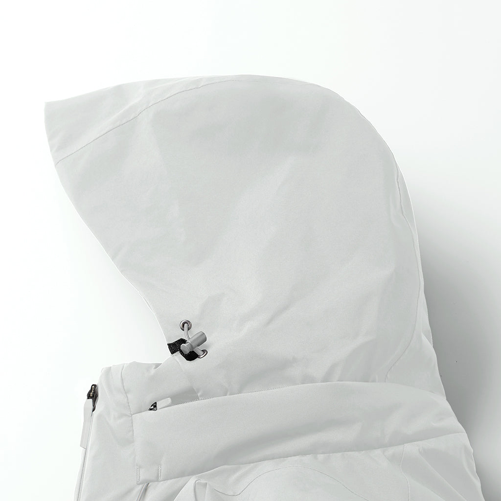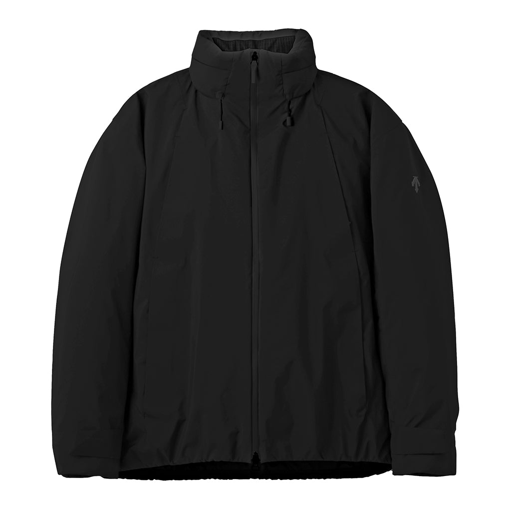 A hybrid insulated jacket in a WINDSTOPPER® product by GORE-TEX LABS. A special ventilated down pack with a unique barrier structure and a ventilation system in the centre of the back encourage airflow inside the garment, expelling uncomfortable heat and moisture, allowing the jacket to breath. The insulation is a hybrid blend of hollow-structured AEROCAPSULE® and SOLOTEX®, which has outstanding softness property. The high loft of the hybrid insulation improves warmth and reduces weight. The lining is DESCTENE's proprietary HEAT NAVI® which converts light into heat and actively retains warmth, providing a comfortable environment inside the garment even in cold conditions. This hybrid outerwear combines the advantages of down and functional insulation with high wind and water resistance.