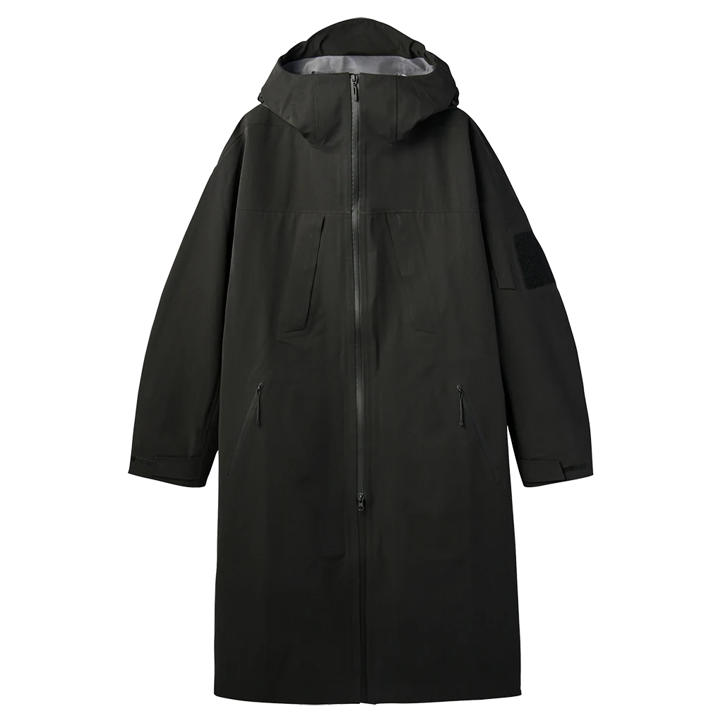 A hard shell hooded coat with a special composite yarn that creates and uneven micro-texture on the surface of the fabric, giving it excellent water repellency. The dual-zip ventilation system on the front allows outside air to enter the garment through a mesh panel placed between two rows of zips, allowing any unpleasant heat and humidity to escape. The cuffs have block fit adjusters that grip even when wet, ensuring an excellent fit. A waterproof long coat with a generous body width and longer length silhouette.