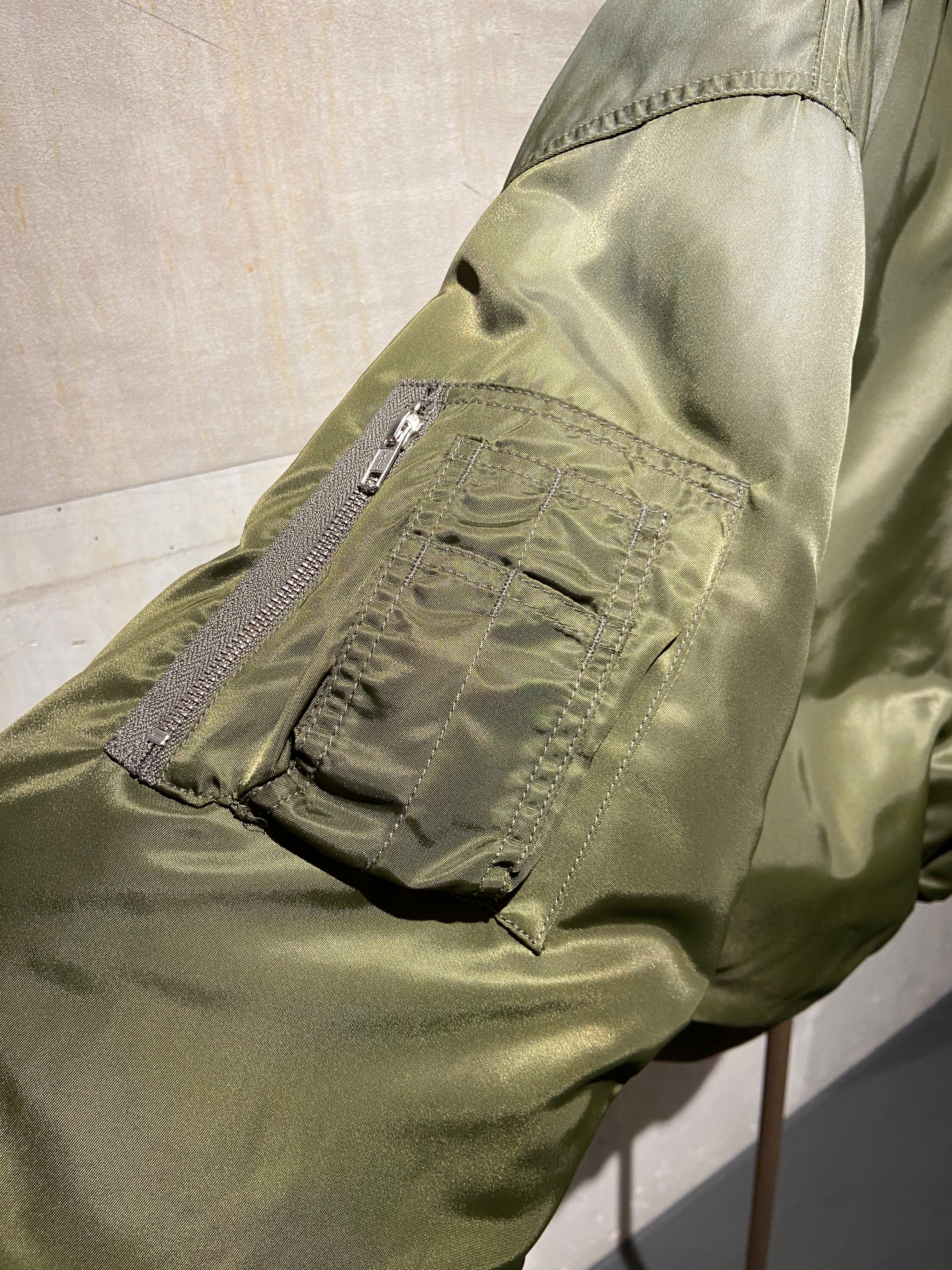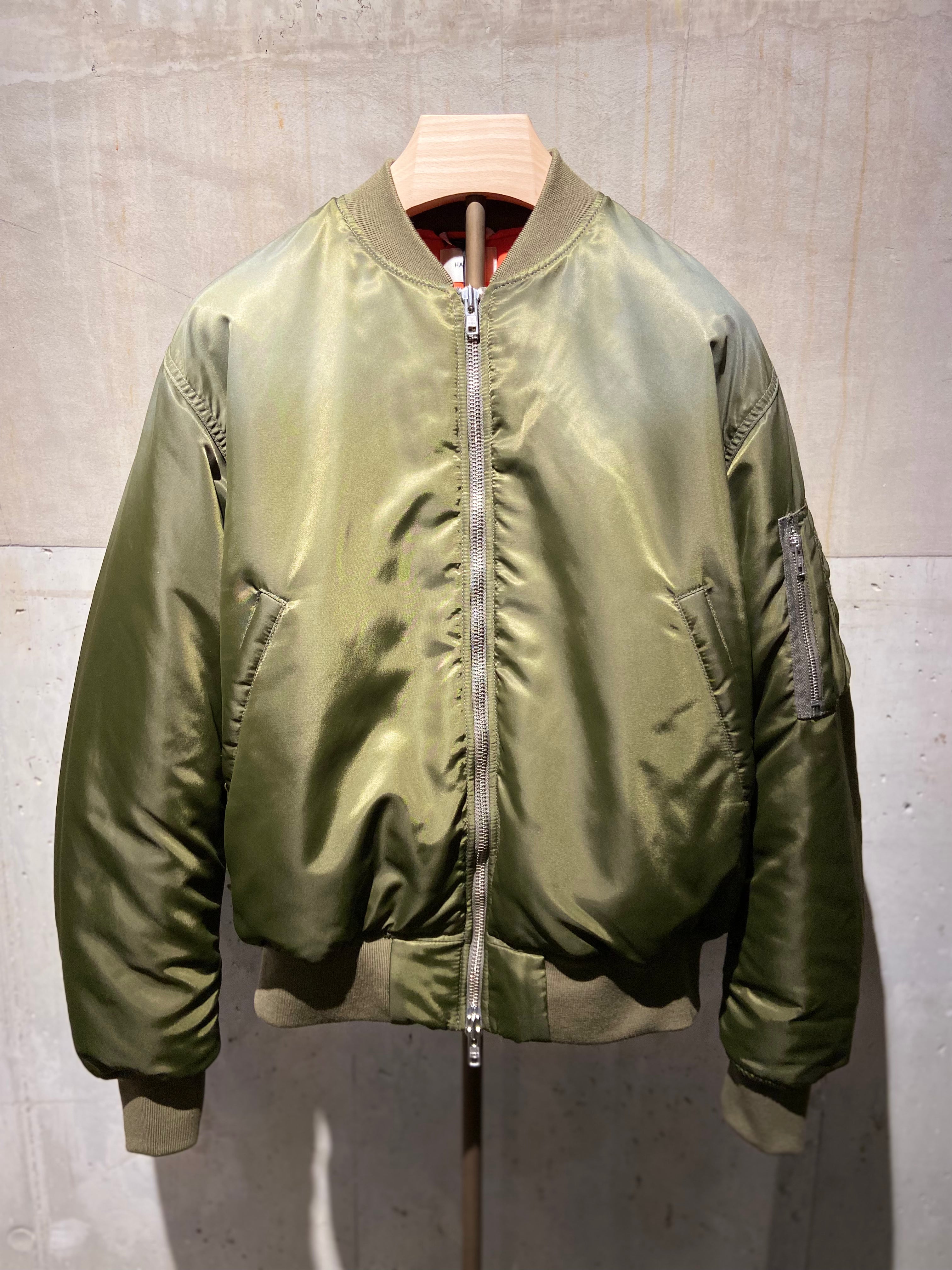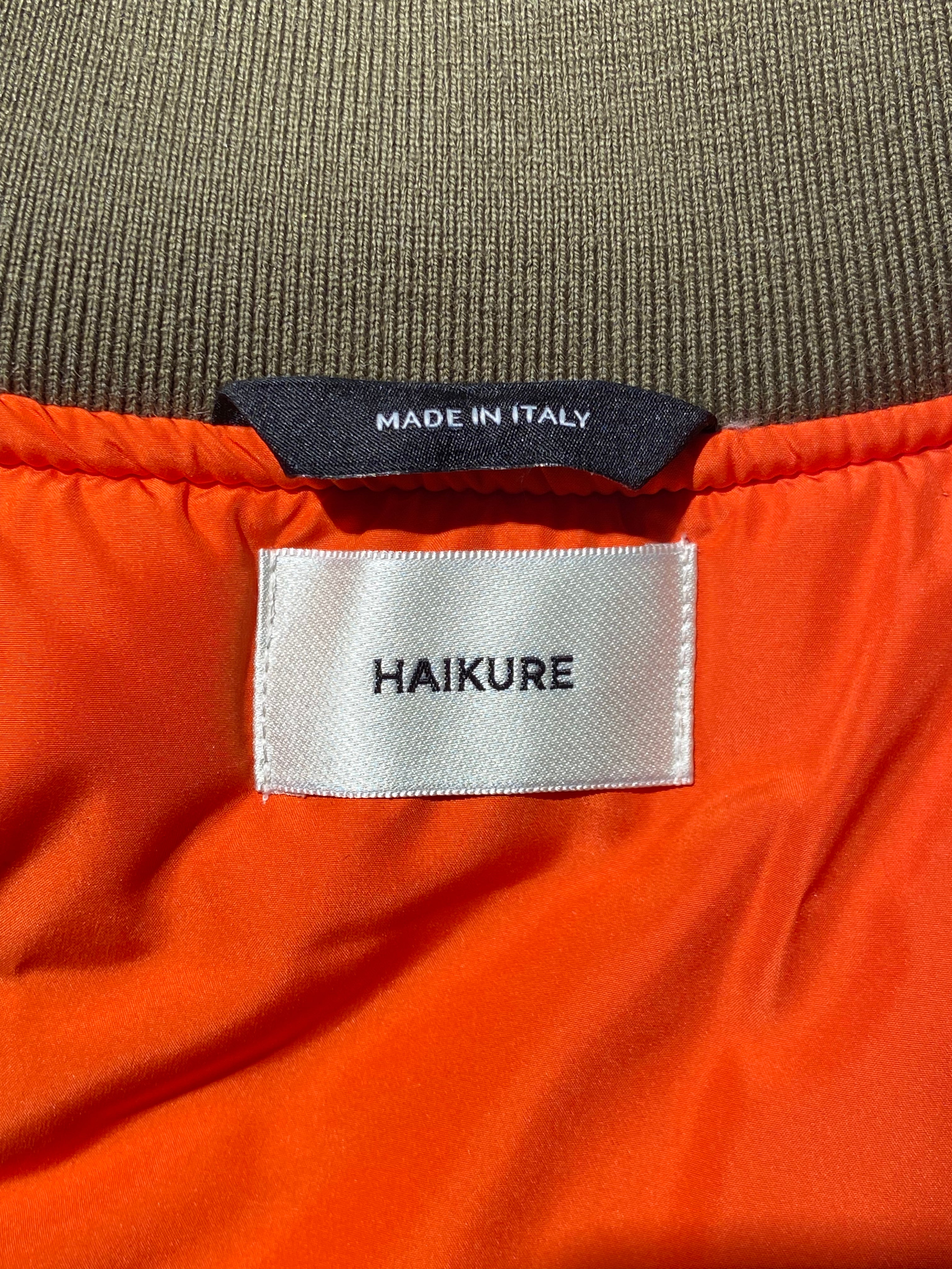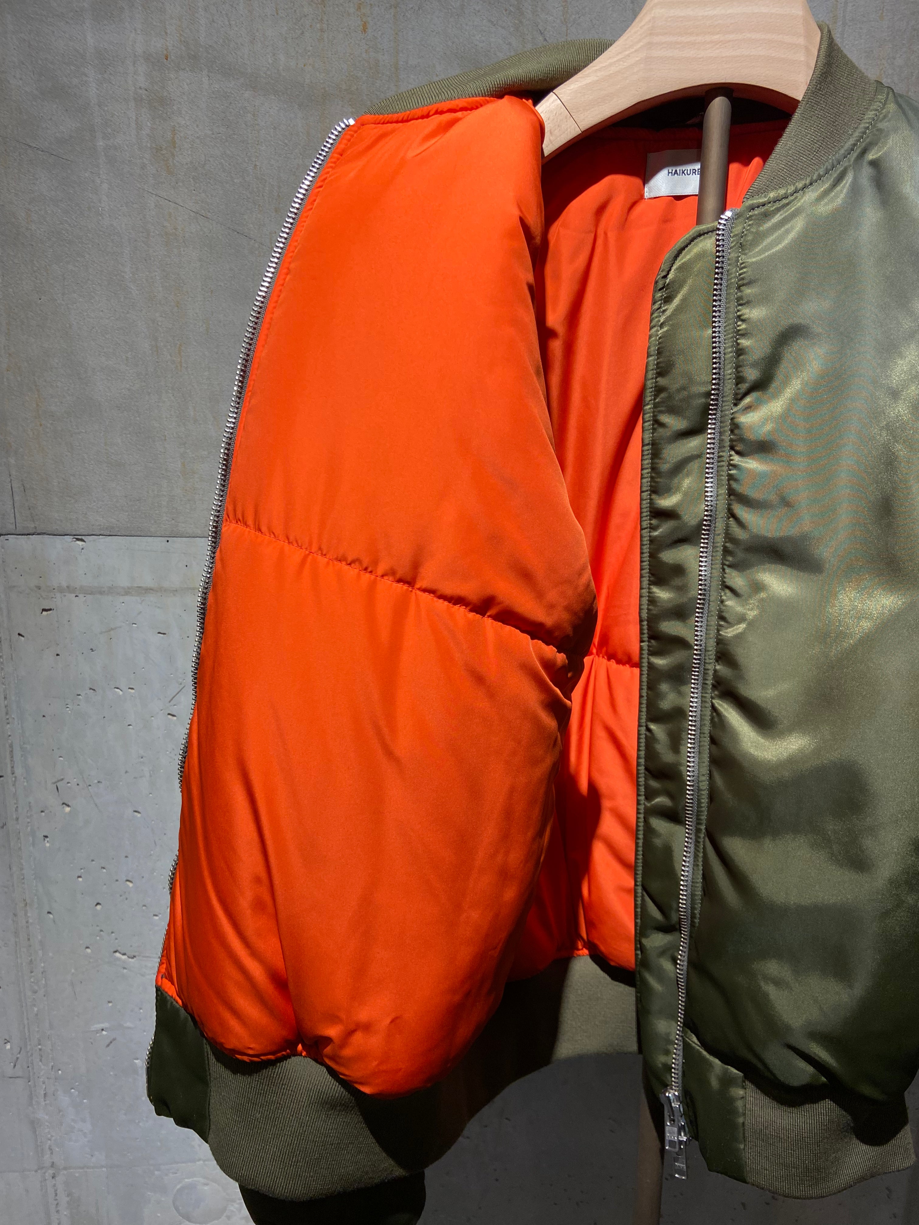 A contemporary bomber jacket in olive-green nylon with a distinctive ombre effect that transitions from a lighter tone at the neck and shoulders to a deeper olive throughout the body. This modern take on a classic silhouette features a cropped, oversized fit that creates a relaxed yet structured look. The jacket is finished with ribbed elastic knit trim at the collar, cuffs, and hem for a snug, comfortable fit, while a two-way double zipper closure provides versatile styling options and easy access. A multi-functional utility pocket is placed on the left sleeve, adding both practicality and military-inspired detailing, complemented by classic slash hand pockets at the front. The orange padded lining adds an unexpected pop of colour and provides warmth, while the embossed HAIKURE logo patch at the upper back reinforces the brand's minimalist aesthetic.