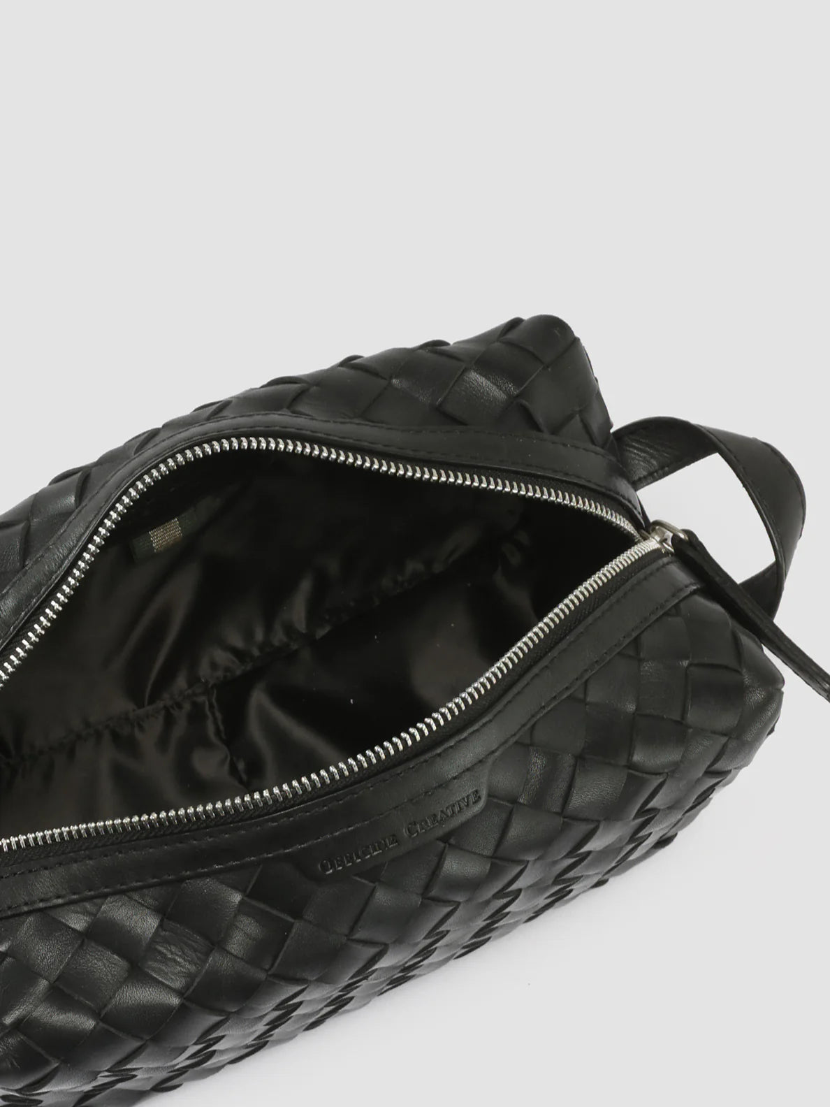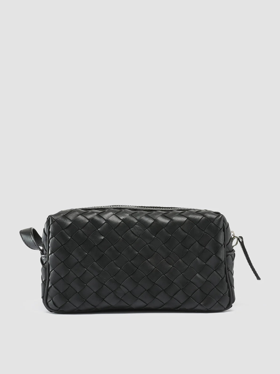 A handwoven black leather pouch showcasing exceptional Italian craftsmanship, featuring strips of leather intricately woven together to create striking textural contrast and enhanced durability making it ideal for everyday essentials or as a travel wash bag. Detailed with subtle silver hardware and lined with water-repellent material.