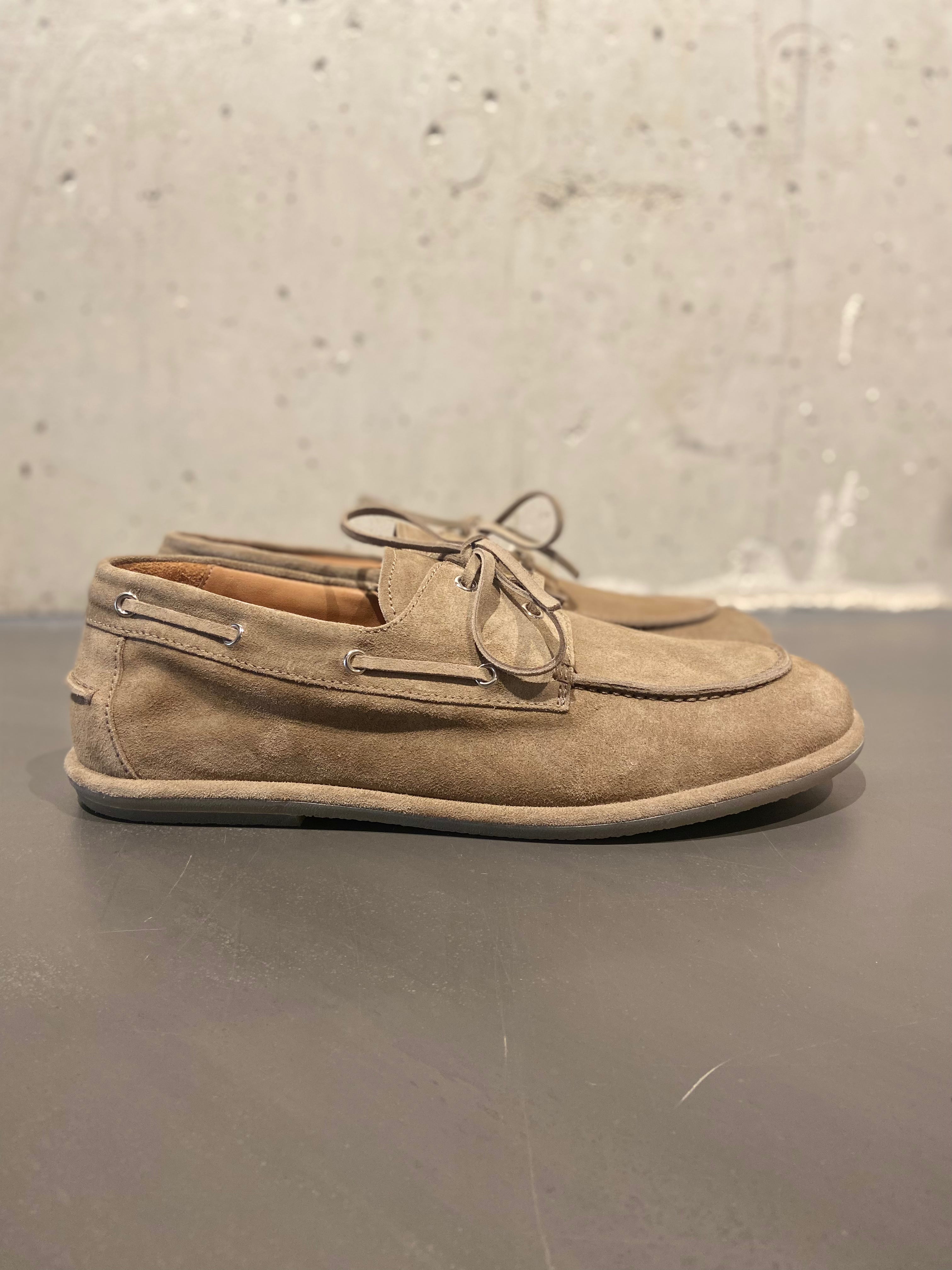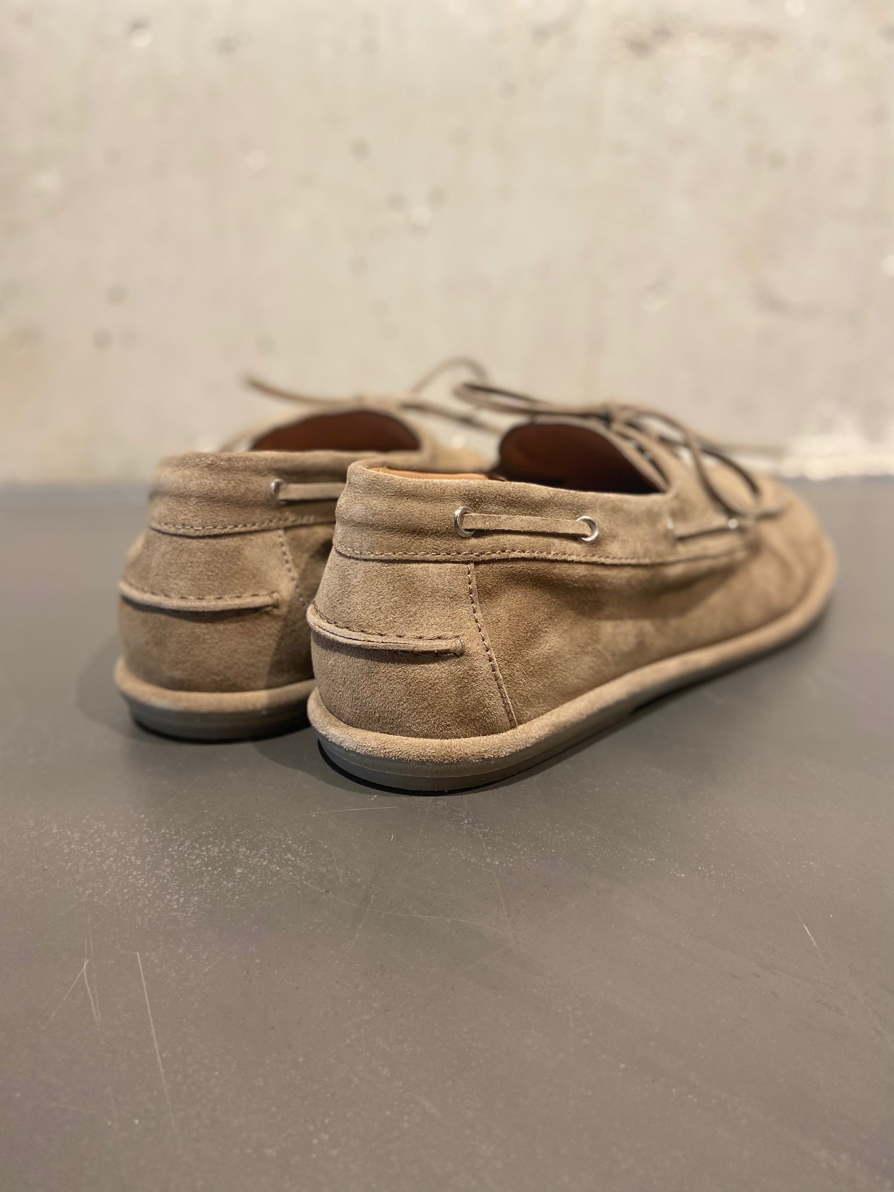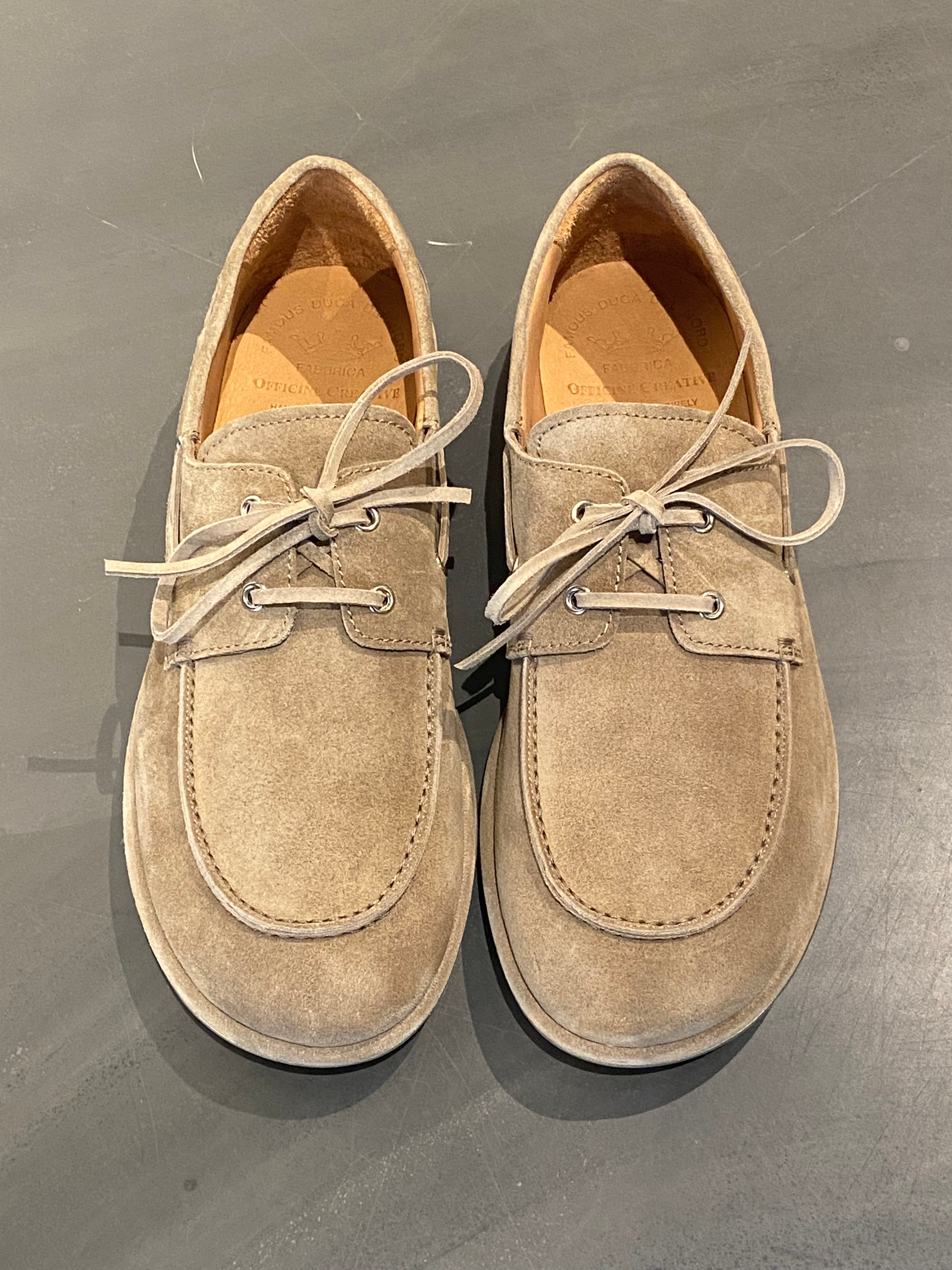 Officine Creative's suede boat shoes in colour taupe, with moccasin stitching on the round toe, leather lace with silver eyelets, and decorative stitching detail on the side and heel. Features a thin summer rubber sole for a lightweight, effortless feel.