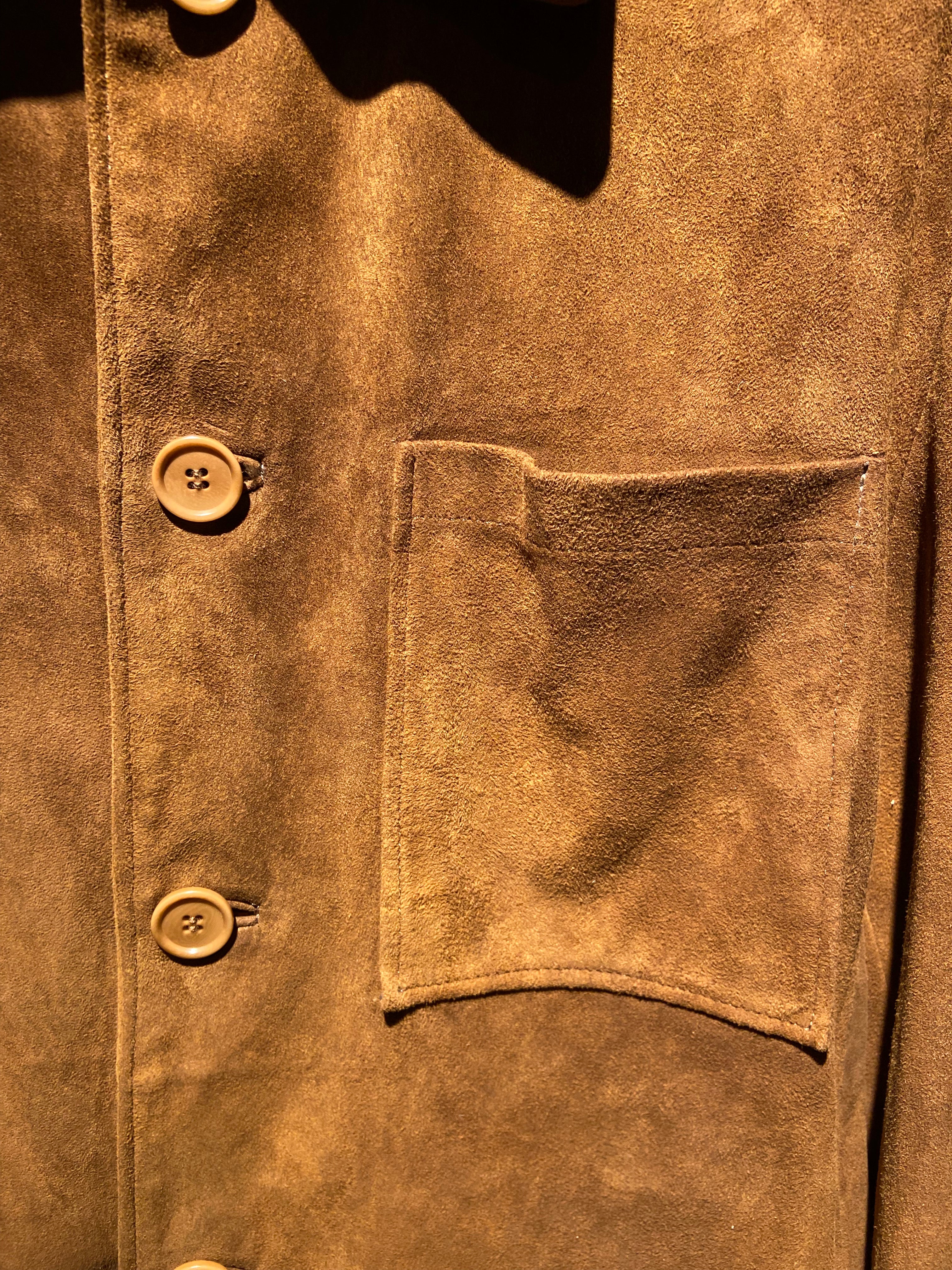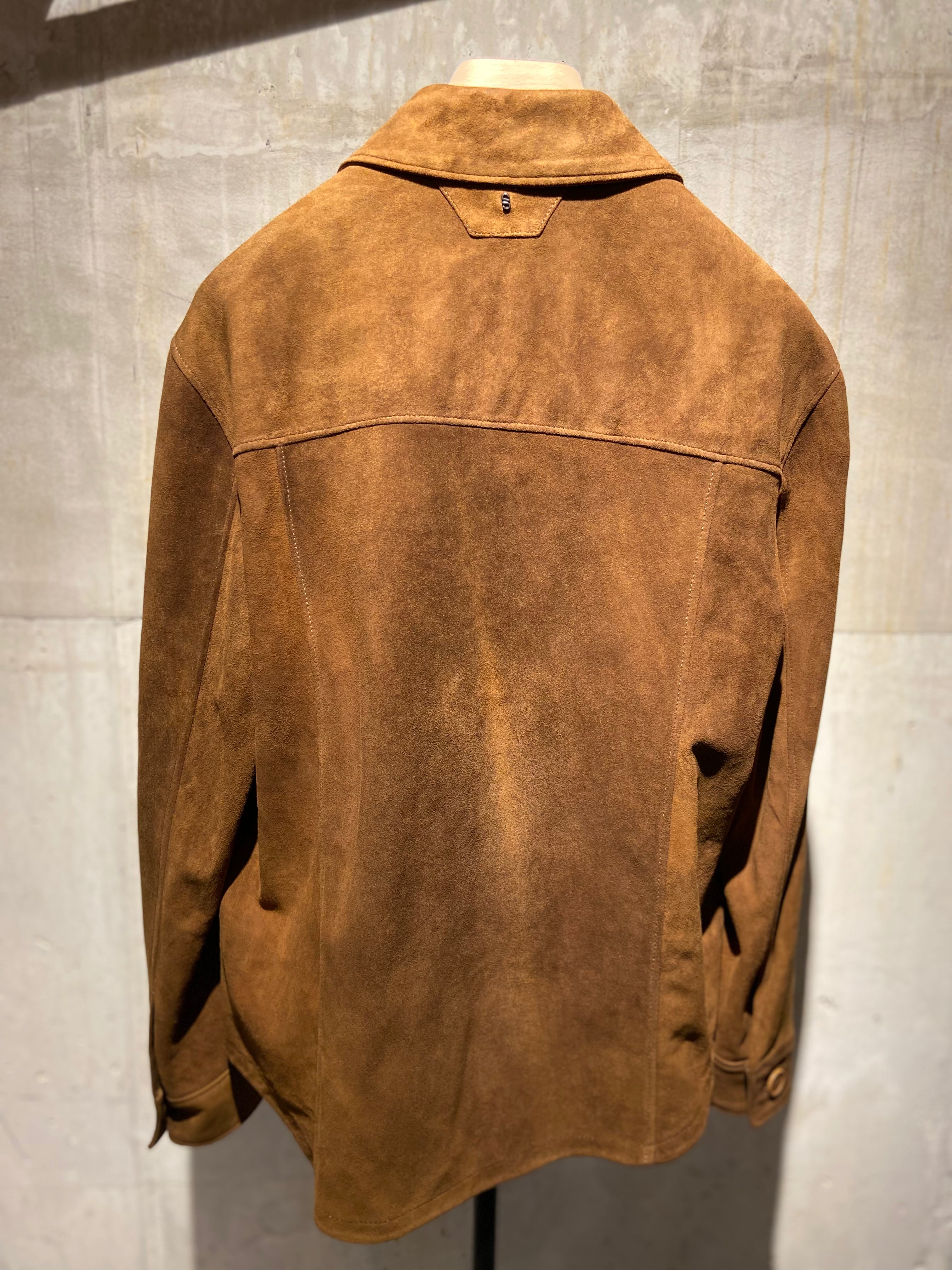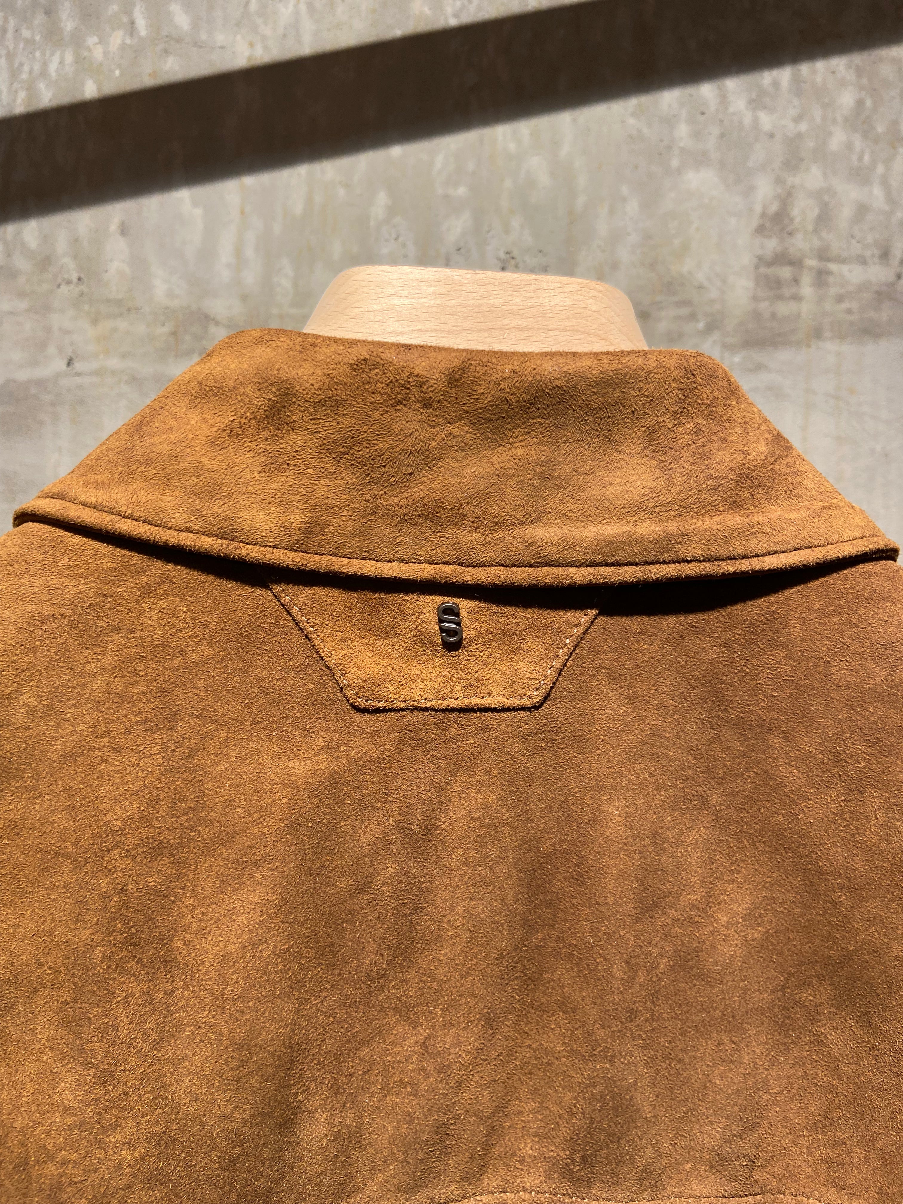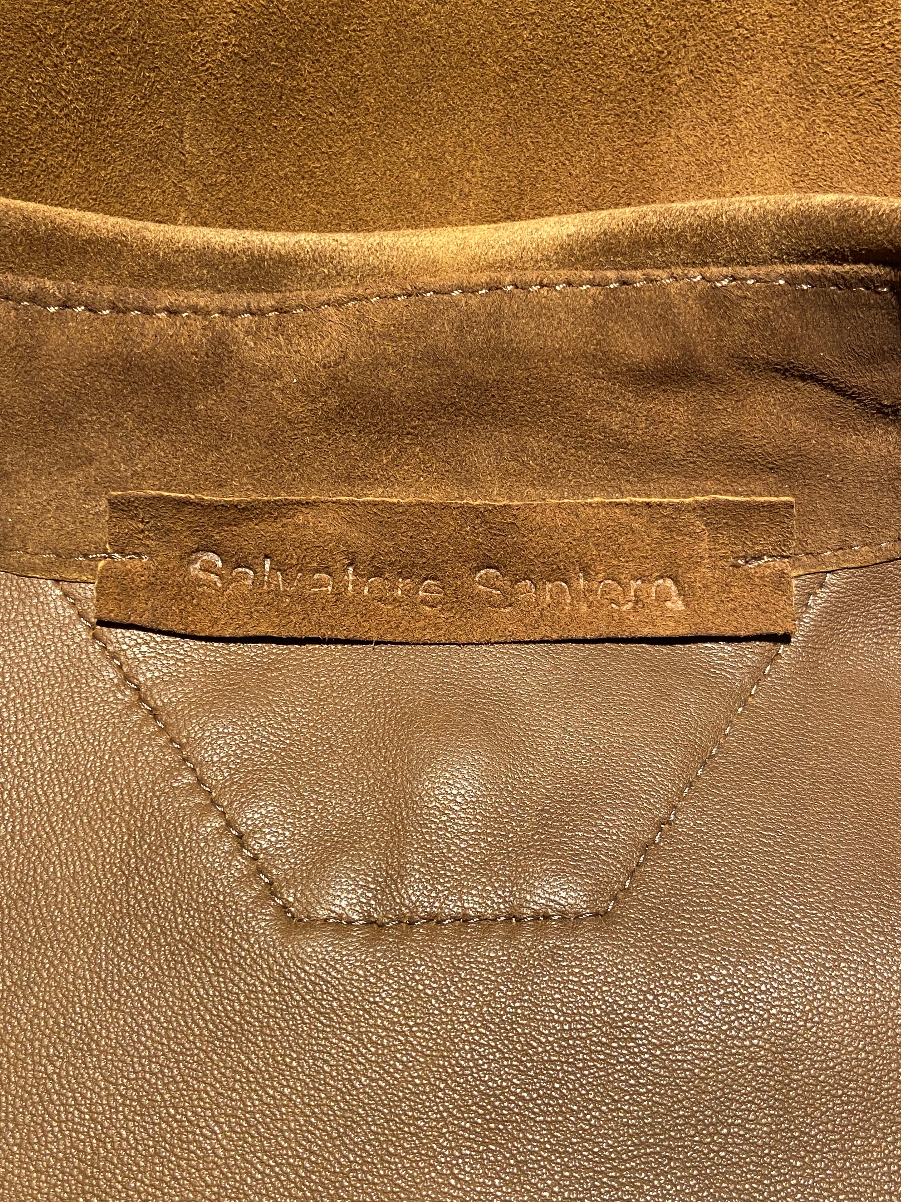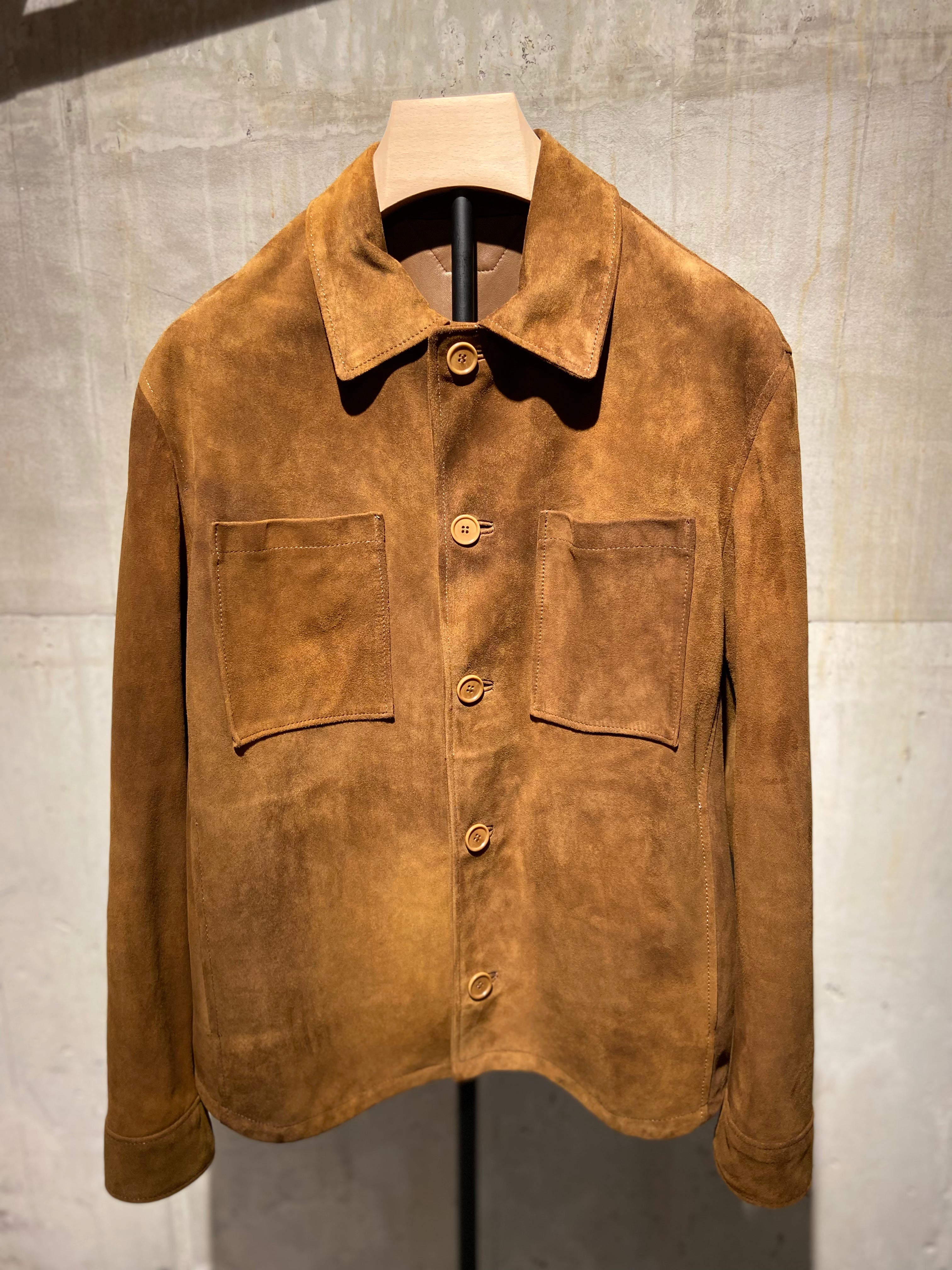 This unlined sheepskin suede jacket in a rich camel tone embodies Salvatore Santoro's artisanal Italian craftsmanship with refined simplicity. The regular fit silhouette features a classic point collar, two chest patch pockets, and two hidden side slash pockets for clean lines. Distinctive tortoiseshell buttons secure the front placket and cuffs, adding warm, organic detailing that complements the natural suede beautifully. The signature metal "S" logo tab adorns the back neck, while the interior reveals embossed "Salvatore Santoro" branding. The soft, supple sheepskin drapes effortlessly, showcasing the brand's signature "second skin" effect with natural tonal variations that highlight the artisanal quality of this timeless piece.